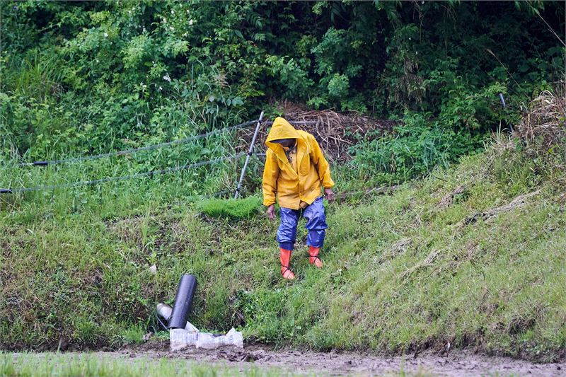 비가 세차게 오자 한 농업인이 우의를 입고 경남 진주시 진성면 들녘의 논에 나와 수로를 점검하고 있다.