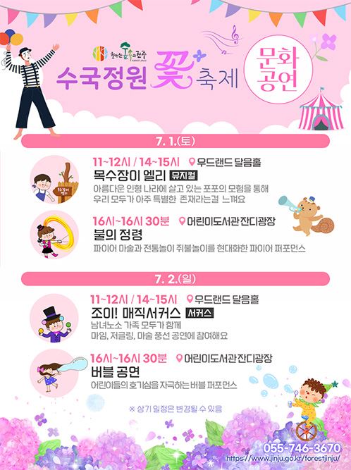 문화공연 중 ‘목수장이 엘리’와 ‘조이! 매직서커스’는 하루 2회 회당 100명씩 사전 예약을 받는다. 관람 신청은 오는 27일(화) 오전 10시 월아산 숲속의 진주 네이버 예약을 통해 가능하다.