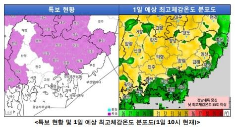 ○ 폭염주의보: 울산, 경상남도(양산, 창원, 김해, 밀양, 의령, 함안, 창녕, 하동, 함양, 합천)