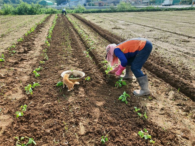 로타리로 파놓은 골에 일정 간격으로 들깨 모종을 심는다. 모종을 심은 뒤 호미로 흙을 덮고 눌러주면 된다. 아기 길고양이가 궁금증에 모종을 담은 대야를 지켜보고 있다.