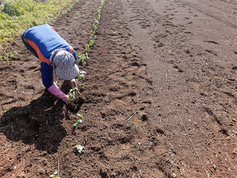 로타리로 평평하게 고른 본밭에 들깨 모종을 심는 모습. 호미로 살짝 판 뒤 한 개씩 심고 다시 호미로 덮은 뒤 눌러주면 된다. 모내기 때의 모줄처럼 쳐놓고 일렬로 심고 있다.
