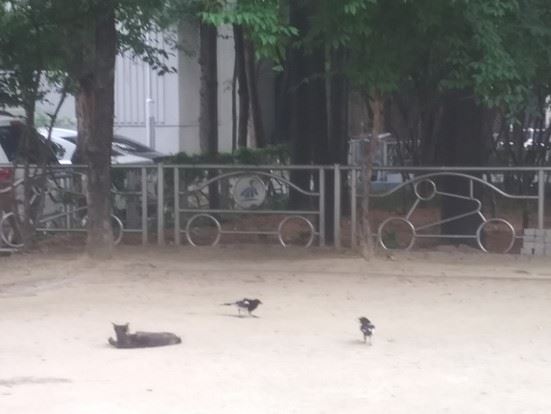 그런데 까치 두마리는 길냥이를 집요하게 쫓습니다. 공격 자세가 무지 앙칼져보이기까지 하네요. '학폭'과 다름없다는 생각도 나고···.