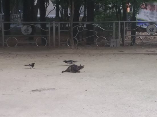 길냥이가 까치 두마리의 전방위 공세에 못이겨 마지못해 자리를 피합니다. 까치가 이긴 장면입니다.
