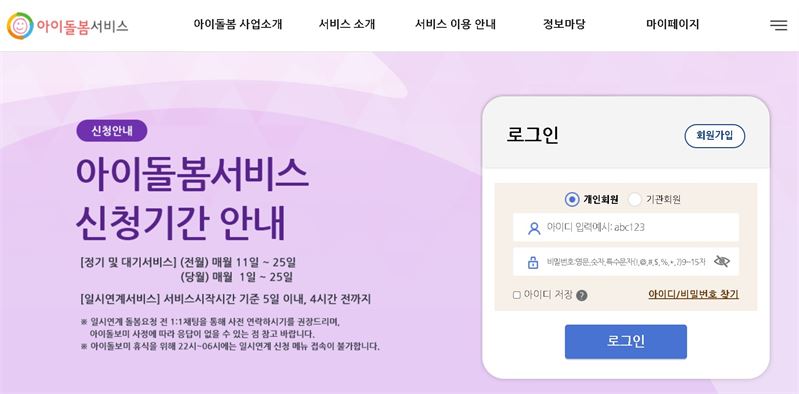 아이돌봄 서비스 희망 가정은 소재지 읍면동 행정복지센터 및 복지로(www.bokjiro.go.kr) 누리집에서 신청 및 지원 결정을 받은 후 아이돌봄서비스 누리집(www.idolbom.go.kr)에 회원가입 및 희망 서비스를 신청하면 된다.