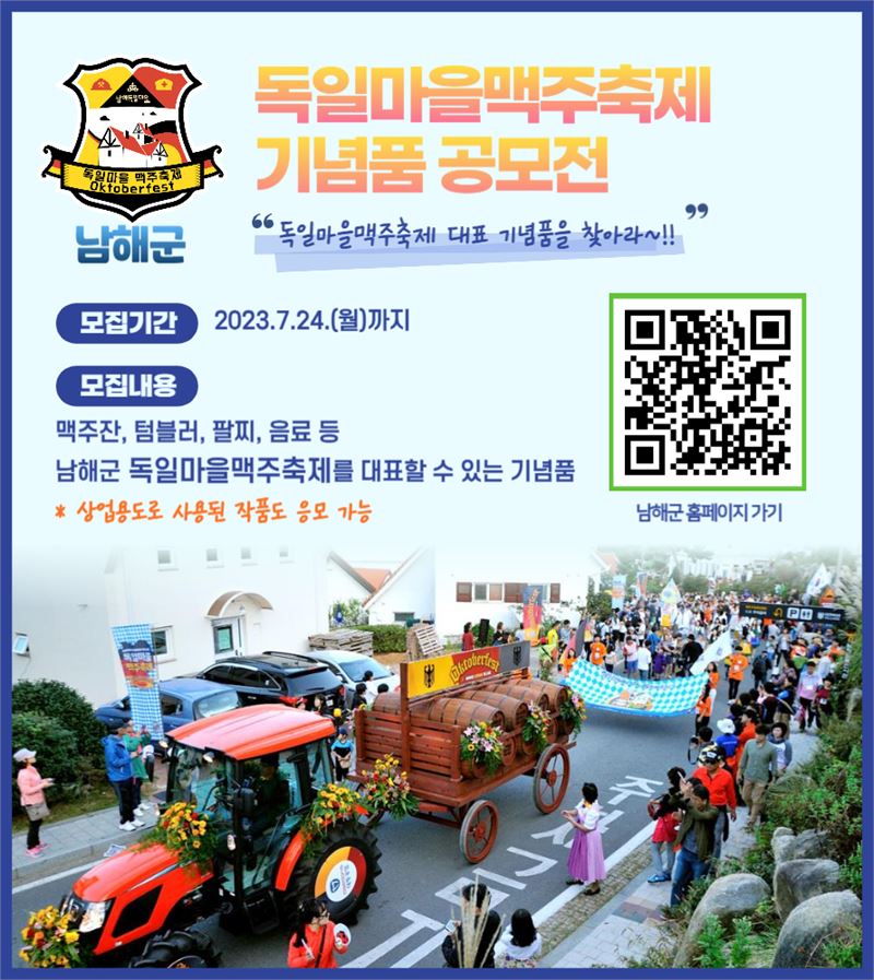 경남 남해군은 독일마을맥주축제를 대표하는 기념품을 발굴하기 위해 ‘독일마을맥주축제 기념품 공모전’을 오는 24일까지 연장한다. 공모 기간은 당초 6월 30일이었다. 공모 기준도 완화됐다.