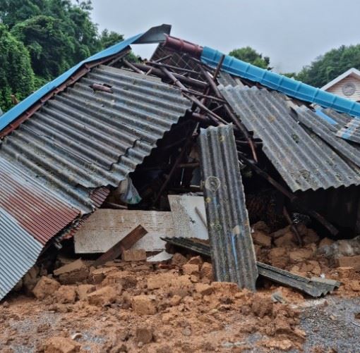 경북 문경시 산북면에서 발생한 산사태로 흙더미가 민가를 덮쳐 주택이 완전히 내려앉았다. 경북소방본부 제공