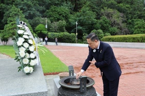 국제라이온스협회 355-C지구 김양근 총재 일행이 17일 마산회원구 국립3·15민주묘지를 참배하고 있다.