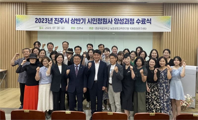 경남 진주시는 지난 28일 경상국립대 칠암캠퍼스에서 권순기 경상국립대 총장, 진주시 관계자 등이 참석한 가운데 ‘2023년 상반기 시민정원사 양성교육 수료식’을 가졌다.