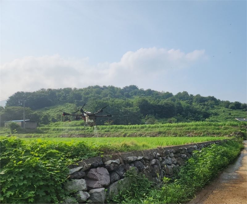남해읍 항공방제단이 지난 5일 드론으로 벼 병해충 방제를 하고 있다. 남해군 제공