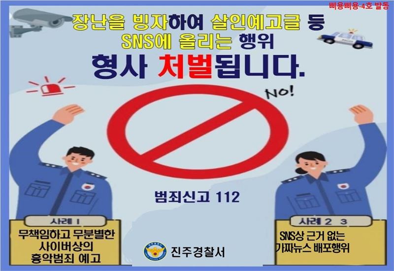 진훈현 진주경찰서장은 “SNS로 살인 예고 글 게시 및 가짜뉴스 배포 등의 행위는 강력하게 처벌된다. 또 국민의 안전을 직접적으로 위협하는 중대한 범죄인 만큼 경찰은 모든 가용병력을 동원해 총력 대응하고 있다”고 밝혔다.