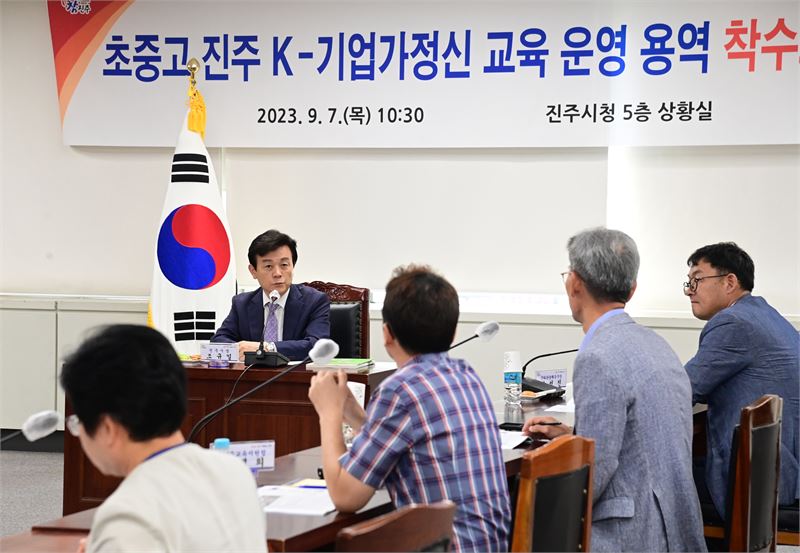 경남 진주시는 7일 시청 5층 상황실에서 조규일 시장과 진주교육지원청, 중소벤처기업진흥공단, 경상국립대 등 유관기관 관계자가 참석한 가운데 ‘초중고 진주 K-기업가정신 교육 운영 용역’ 착수보고회를 개최했다.