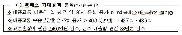 특히 시민실천 방안 중 동백패스의 사용 기대효과는 교통 혼잡비 연간 2400억 원 감소, 탄소 배출량 연간 33만t이 감소할 것으로 분석돼 동백패스가 활성화되면 환경과 경제 두 마리 토끼를 잡을 것으로 기대된다.
