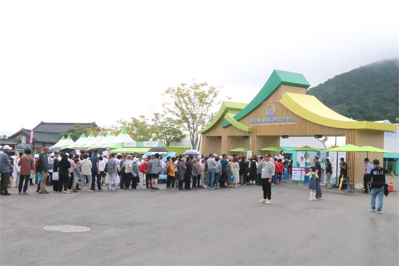 17일 산청 동의보감촌 행사장 입구에 개장(오전 10시) 전 대기열이 길게 이어져 있다.
