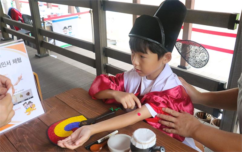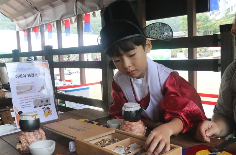 한 어린이 관람객이 어린이 혜민서 체험을 하고 있다.