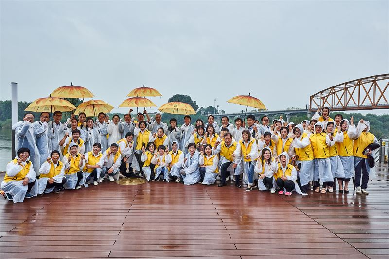'대한민국 부자 1번지' 명명식 참석자들이 해바라기 우산을 이용해 '리치리치' 문구를 만드는 이벤트를 하고 있다. 이상 의령군 제공