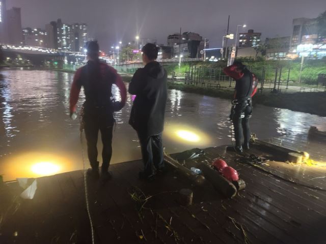 20일 밤 소방대원들이 부산 금정구 부곡동 온천천 변에서 불어난 물을 바라보고 있다. 이날 오후 5시 48분 한 여성이 물에 빠져 기둥을 붙잡고 있다는 신고가 접수돼 현장에서 구조를 준비하던 중 이 여성은 물에 떠내려가 실종됐다. 부산소방재난본부 제공