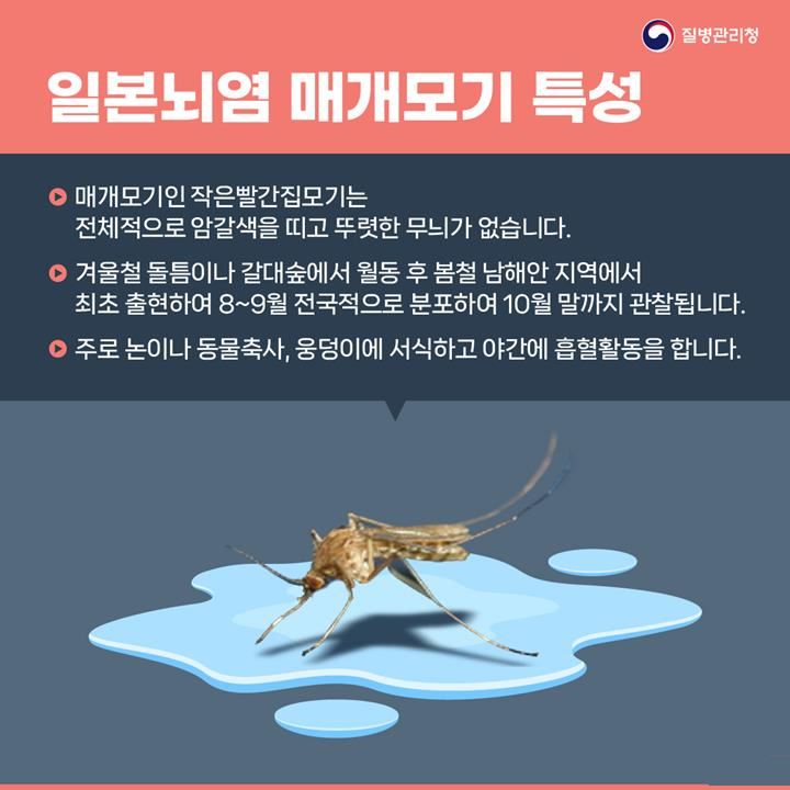 ‘일본뇌염’은 작은빨간집모기에 물렸을 경우 혈액 내로 전파되는 일본뇌염 바이러스에 의해 급성으로 신경계 증상을 일으키는 감염병으로 모기의 활동이 활발한 9~10월에 80%가 발생한다.
