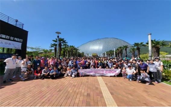 경남 함양시니어클럽 회원들이 경남 거제시 거제면 서정리 거제식물원 정글돔을 배경으로 기념사진을 찍고 있다. 이상 함양군 제공