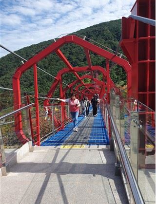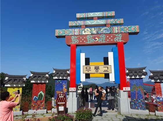 무릉교는 이른바 출렁다리로 211m에 이릅니다. 건너다 보면 다리가 끊어지지 않을까 내심 걱정을 하지만 내진설계 1등급으로 초속 30m 강풍에도 안전하고, 성인(70kg 기준) 1570명이 동시에 지나도 끄떡없게 설치했다고 합니다.