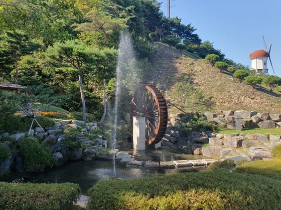 동의관에서 걸어 내려오면 다소곳이 자리잡은 물레방아 분수공원. 사진 촬영 장소로 인기다. 저 위쪽에 풍차 모형 건물이 보인다.