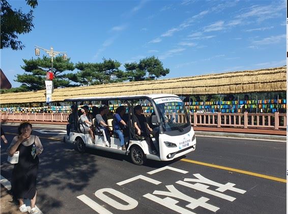 동의관과 무릉교 구경을 끝낸 관람객들이 차량을 타고 내려가고 있다.