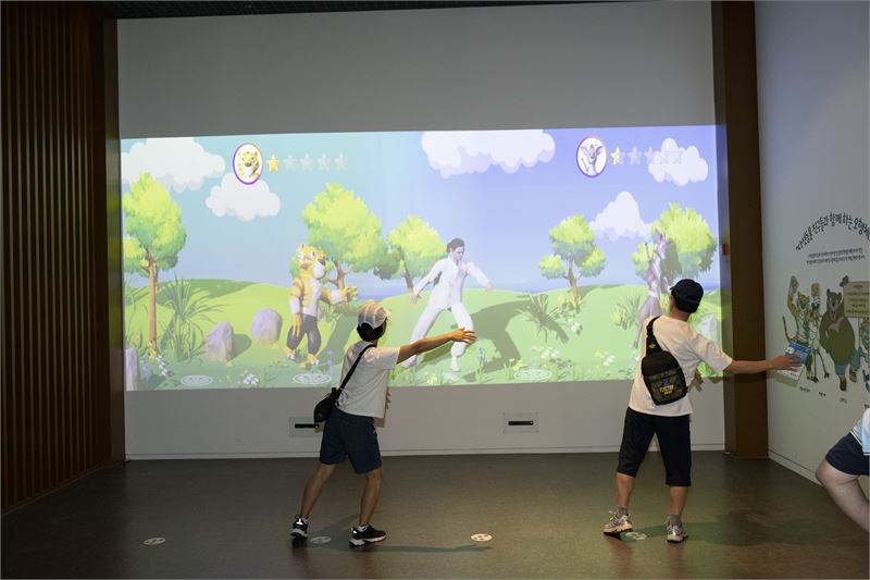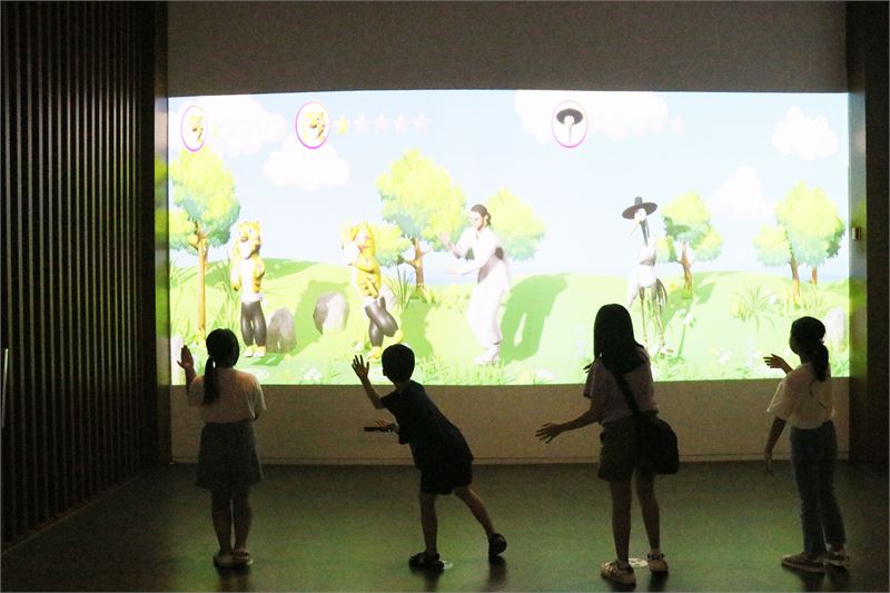 어린이들이 기공체조 게임형 콘텐츠인 ‘몸 튼튼, 마음 튼튼 동의체조’ AR(augmented reality·증강현실) 코너에서 흥미롭게 따라하고 있다.