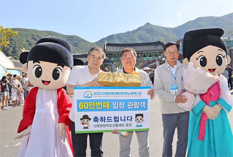 (재)산청세계전통의약항노화엑스포조직위원회(공동위원장 박완수 도지사, 이승화 산청군수, 구자천 경남상공회의소협의회장)는 엑스포 개장 16일째인 1일 ‘입장객 60만 명 돌파’ 깜짝 이벤트를 개최했다. 엑스포는 오는 19일 폐막한다.