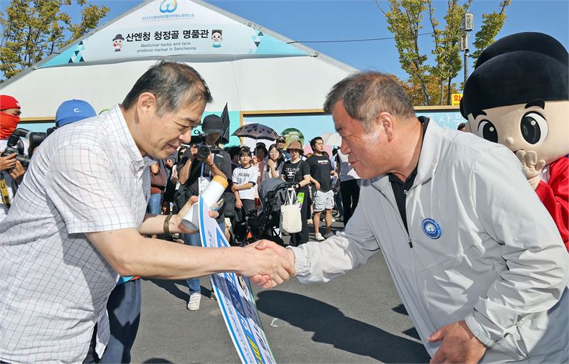 이승화 산청군수와 60만 번째 입장객 대구 손호익 씨가 손을 잡고 행사장을 둘러보고 있다.