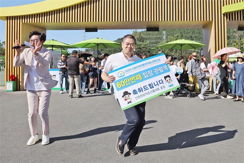 이날 오후 3시쯤 주 게이트를 통과한 60만 번째 입장객은 대구에 거주하는 손호익(57) 씨로 행운의 주인공이 됐다. 조직위는 꽃다발과 함께 한방약초 선물세트를 전달했다.