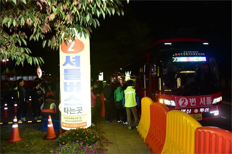 진주 시민들은 자가용보다는 ‘축제장 가는 버스’ 안내문이 부착된 시내버스를 이용하면 축제장소로 이동이 훨씬 용이하며, 승용차로 축제장을 방문하는 외지 관광객들은 시 외곽에 조성된 임시주차장에 차량을 주차한 후 셔틀버스를 이용하면 좀 더 편리하게 축제를 즐길 수 있다.