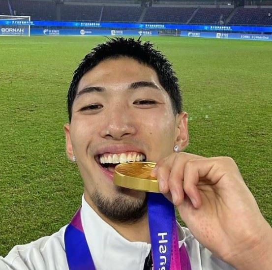 아시안게임 금메달을 깨무는 박규현. 박규현은 울산 현대고를 졸업, 2019년 독일 베르더 브레멘에 입단했고 현재 독일 3부 리그인 디나모 드레스덴에서 주전으로 활약하고 있다. 드레스덴은 ‘오늘 박규현이 아시안게임 우승을 차지했습니다. 축하해요 파키(Parki)!’란 축하 메시지를 보냈다. 드레스덴 SNS 캡처