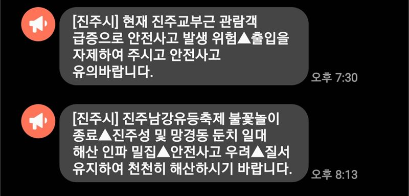 극심한 혼잡이 예상되자 진주시가 시민과 관광객들에게 보낸 안전 안내문자 내용