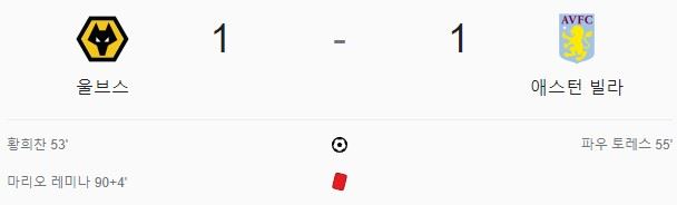 울버햄프턴은 황희찬의 득점 이후 2분 만에 애스턴 빌라의 파우 토레스에게 동점골을 맞아 1-1로 경기를 마쳤다.