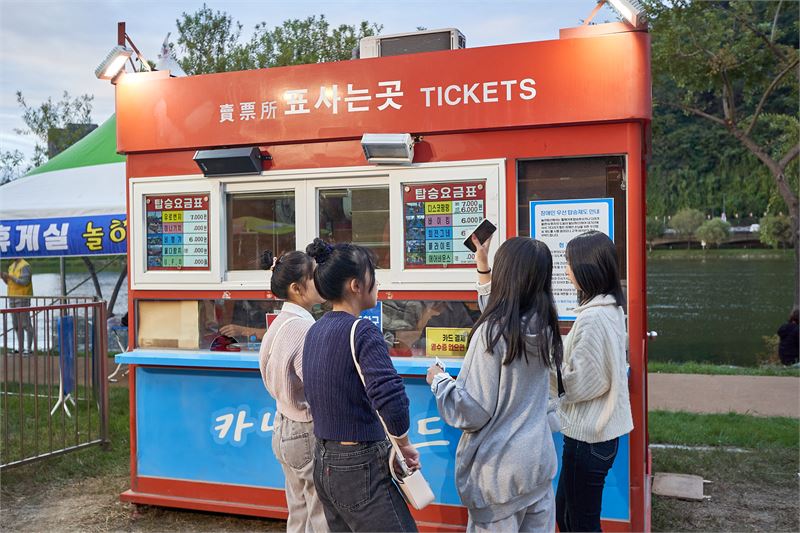 학생들이 놀이기구를 타기 위해 표를 구매하고 있다.