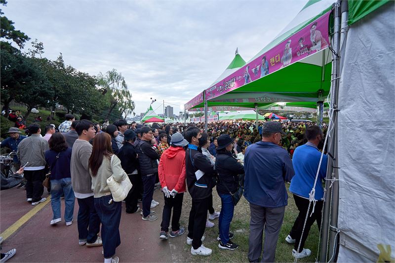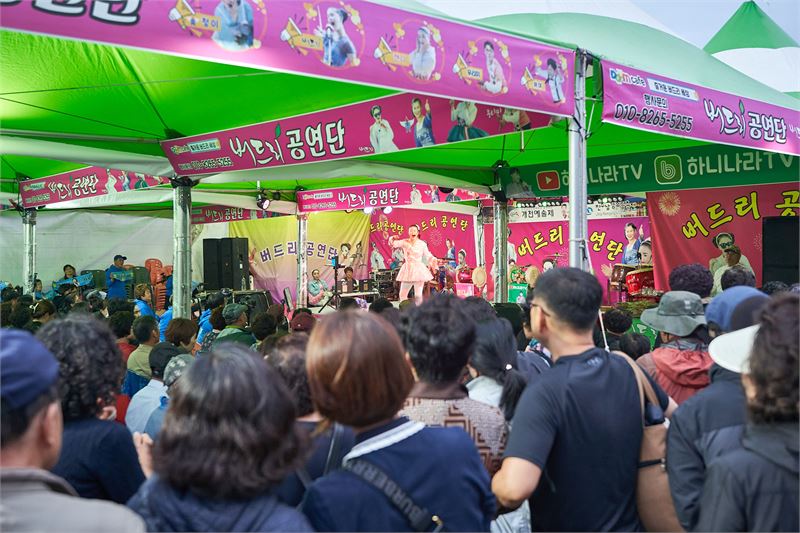 시민과 관광객들이 '품바의 여왕' 버드리 공연단의 공연을 보기 위해 공연장 앞에 가득 몰려있다.