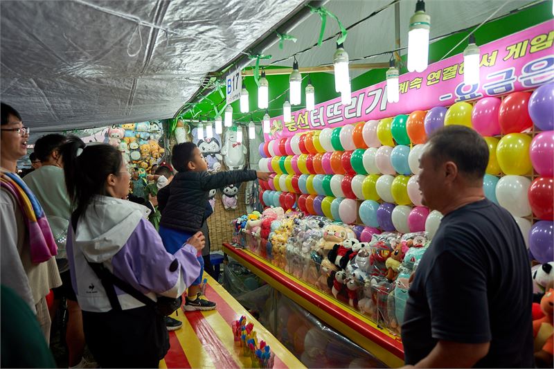 어린이가 풍선을 터뜨린 뒤 받은 상품을 보고 좋아하고 있다.