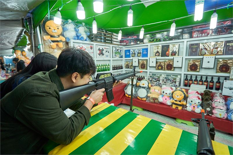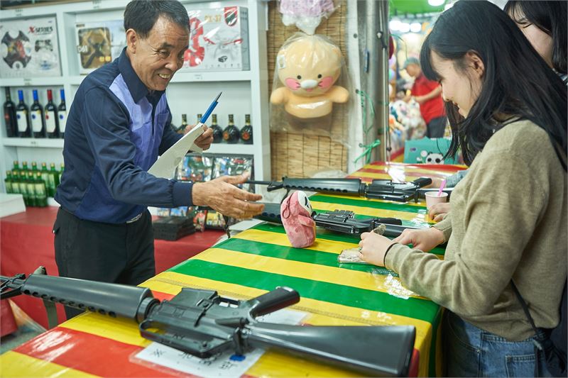 BB탄 사격을 끝낸 여성이 점수에 맞는 상품을 받고 있다.
