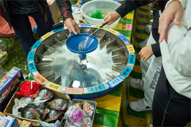 추억의 물방개 게임. 물방개를 가운데 구멍으로 넣고 물방개가 도달하는 곳의 상품을 받아가는 게임이다.