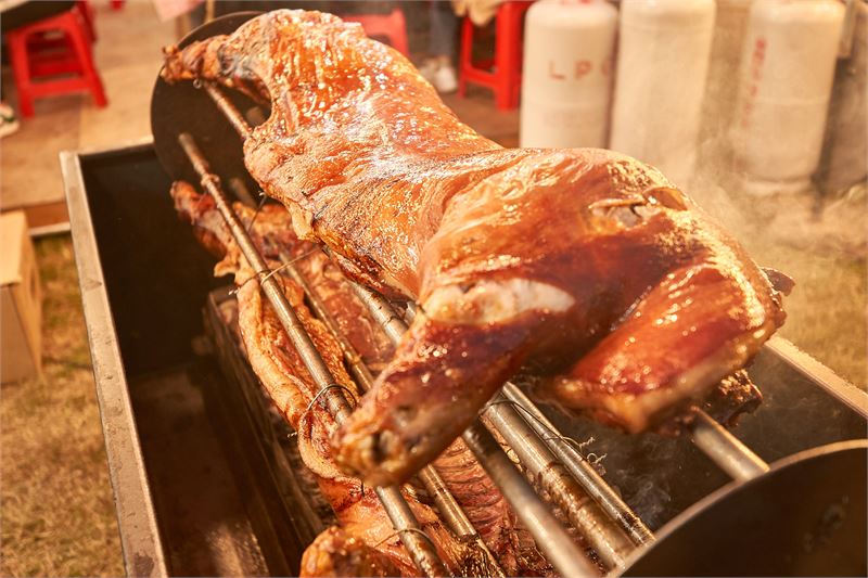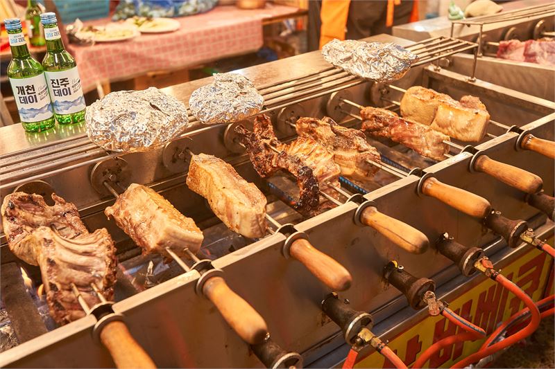 먹음직스럽게 익고 있는 바베큐. 왼쪽 소주병에 창원의 주조업체인 무학의 '좋은데이'를 원용한 '개천데이', '진주데이'가 이채롭다.