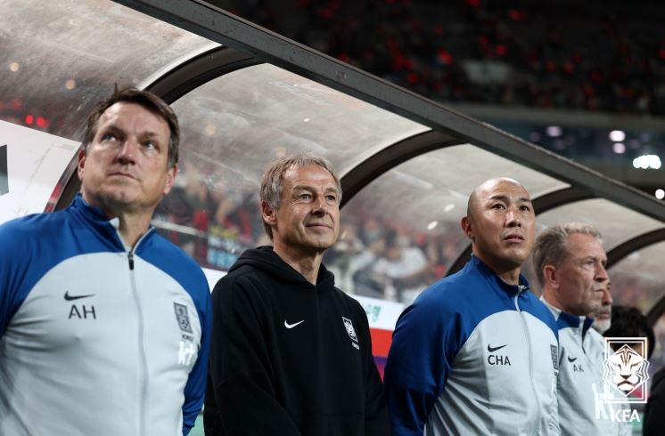 클린스만 감독을 비롯한 한국 코치진들이 튀니지 전을 지켜보고 있다.
