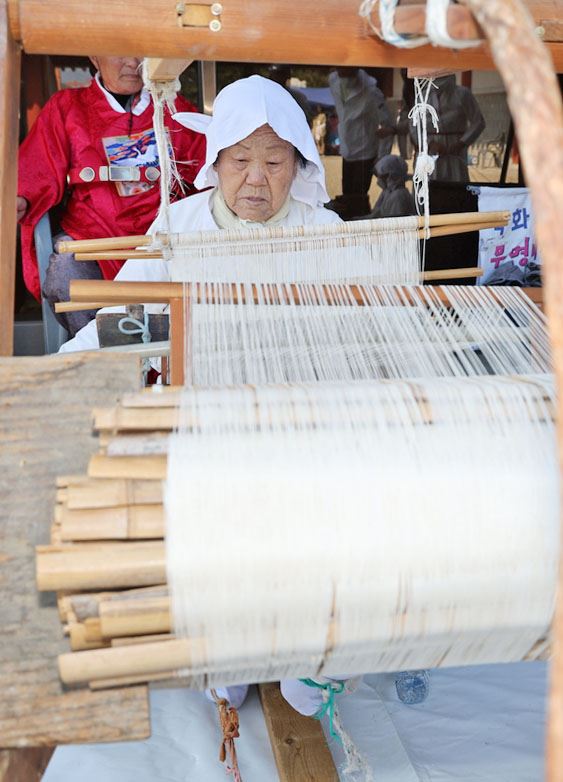 전통무명 베짜기 시연. 베틀로 목화에서 만들어낸 실을 짠다.
