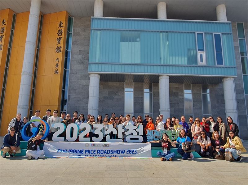 외국인들이 동의보감촌 주제관 앞에서 방문 기념사진을 찍고 있다.