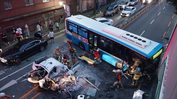 지난 8월 5일 경남 창원시 마산회원구 석전사거리 인근 도로에서 발생한 택시와 시내버스, 승용차의 충돌 사고 모습. 택시가 형체를 알 수 없을 정도로 찌그러져 있다. 창원소방본부 제공