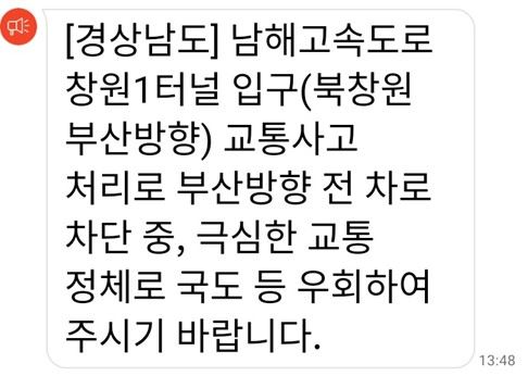 경남도는 오후 1시 48분쯤 안전안내문자를 보내 창원1터널 교통사고 처리로 극심한 차량정체 중이라며 국도 등으로 우회할 것을 당부했다.