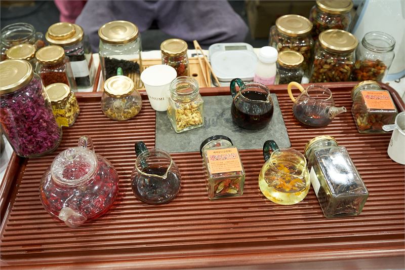 진열된 다양한 꽃잎차들