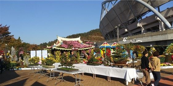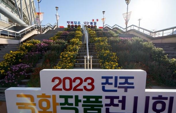 진주종합경기장 입출구 계단에도 갖가지 국화가 푸짐하게 전시돼 평지와 다른 색다른 분위기를 자아낸다.