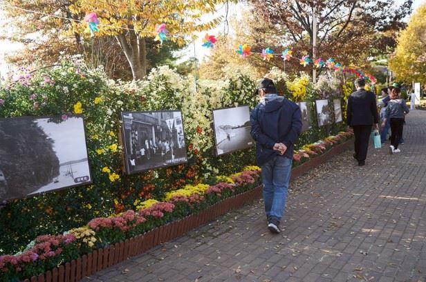 국화 향기를 맡으며 천년 고도 진주의 역사를 음미하는 '진주 옛사진 전시' 공간. 특별해 보이는 길이다.