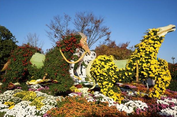 달리는 말 형상 국화 조형물. 생동감을 더하고 있다.