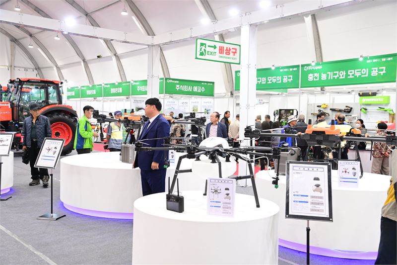 농기자재관에 드론과 트렉터 등 각종 최신 첨단 농기자재 등이 전시돼 있다.