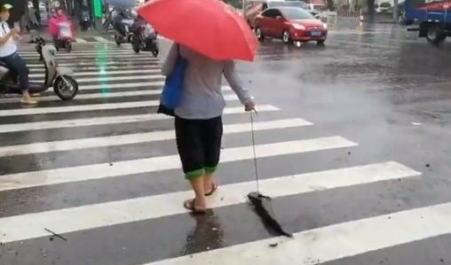 중국에서 비 오는 날에 목줄을 차고 한 여성과 함께 횡단보도를 건너는 물고기 모습이 화제로 등장했다.